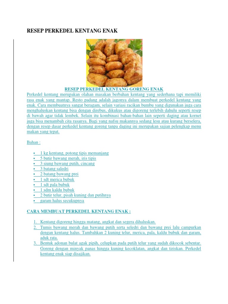 Perkedel kentang adalah olahan makanan yang biasanya dimasak dengan cara digoreng, dengan mencampurkan bahan utama yaitu kentang yang sudah dihaluskan dengan. Perkedel khas warteg ini populernya sudah ke seluruh indonesia. Instagram @rasamamanda) (inews.id/esa putra tanjung). Cara membuat perkedel kentang memang tidak sulit untuk dilakukan di rumah. 1 buah kentang ukuran sedang 1 butir telur ayam, kocok lepas 1 batang seledri, iris halus 1/2 sendok teh merica 2 siung bawang putih, goreng utuh 1 sendok makan peres tepung terigu 1 sendok makan peres tepung beras.